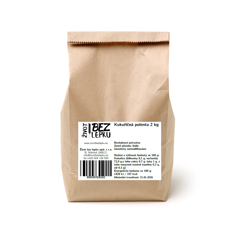 Bezlepková instantní forma tepelně upravené kukuřičné krupice, vyrobená ze surovin, které nebyly geneticky modifikované.