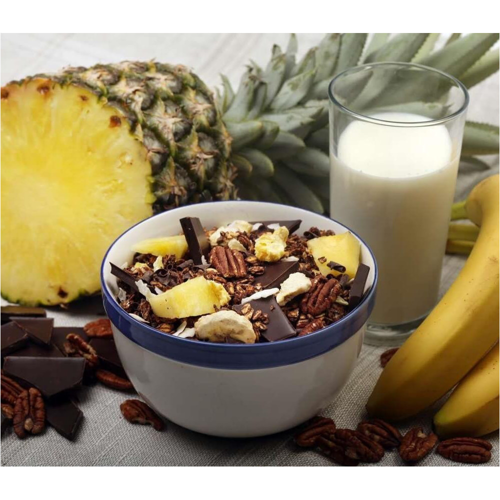 - bezlepkové ovesné vločky, pekanové ořechy, med, hořká čokoláda (cukr, kakaové máslo, kakaová hmota, slunečnicový lecitin, přírodní vanilkové aroma), olivový olej, kokos, holandské kakao (3 %), lyofilizovaný ananas a banán