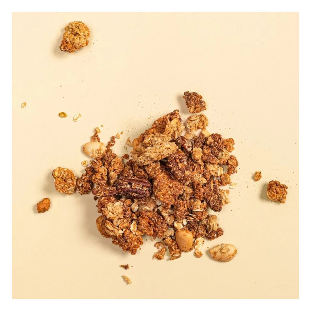 - ovesné bezlepkové vločky, kešu pasta (23 %), javorový sirup, kešu ořechy, mandle blanšírované, pekanové ořechy, slunečnicový olej, mořská sůl.