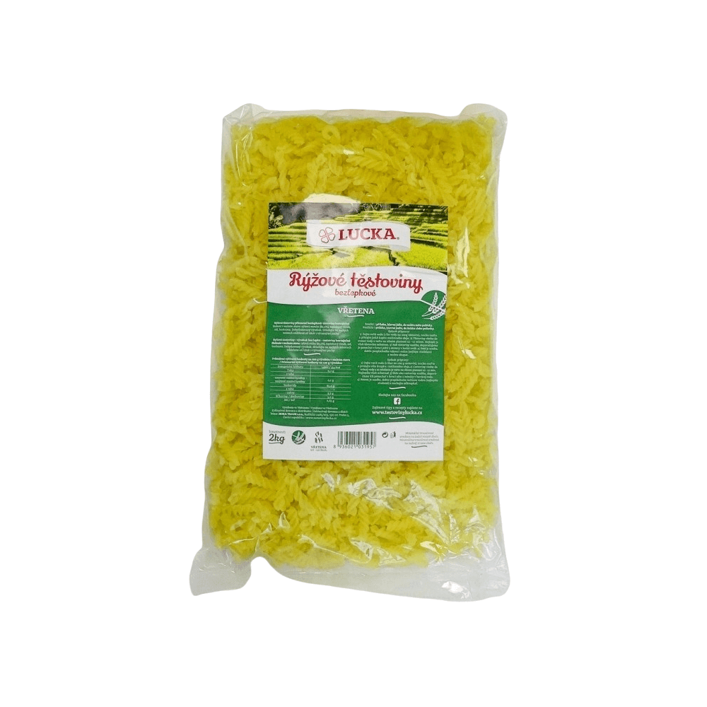 Bezlepkové bezvaječné ryžové cestoviny v tvare vretien.
