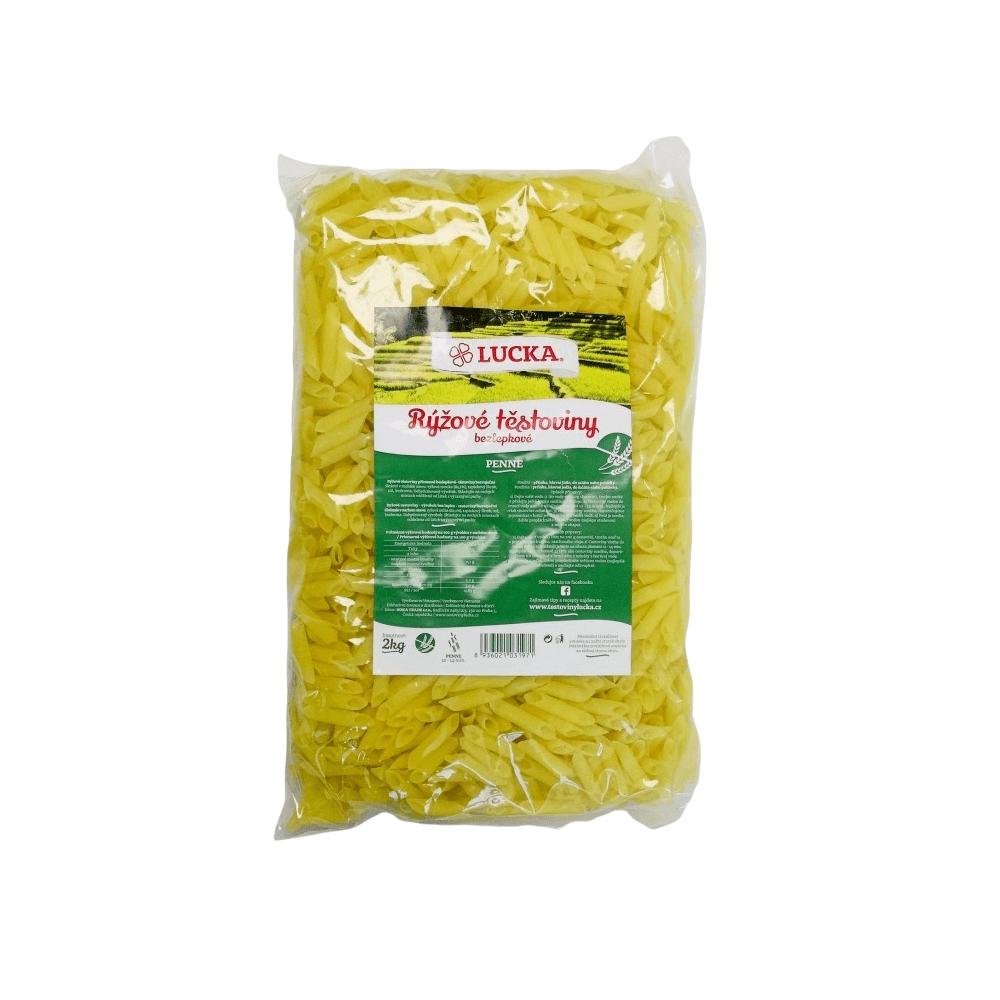 Bezlepkové bezvaječné ryžové cestoviny v tvare penne.